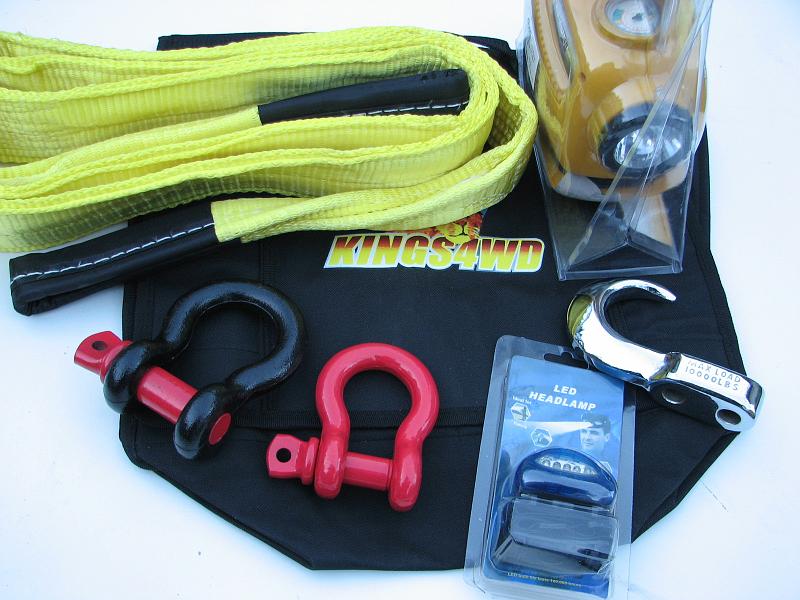 Kompresor s baterkou a nanometrem, chromovaný hák, šekl 3,2t a 4,7t čelovka, kurta 2,5m.